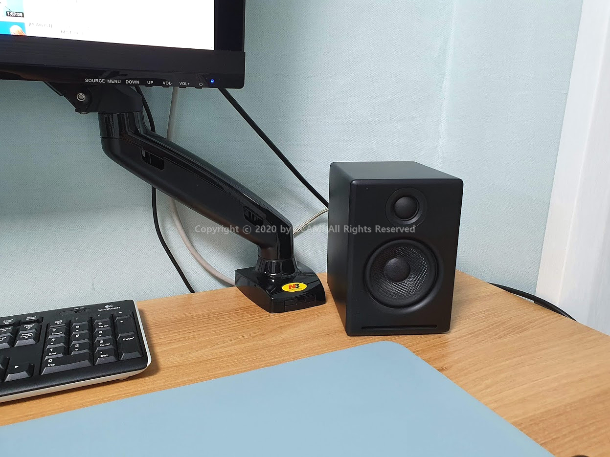 원래 오디오엔진 A2 스피커가 놓여있던 모습이다. 이렇게 거의 뭐 몇년을... (5년 이상을) 사용해 오고 있었고 그렇게 불만은 없이 사용해왔던 것 같다. 좀 책상이 얇아서 저음으로 인한 진동이 약하게 느껴지긴 했던 것 같기도 하다. 너무 예민하게 구는 것 같기도 하고.